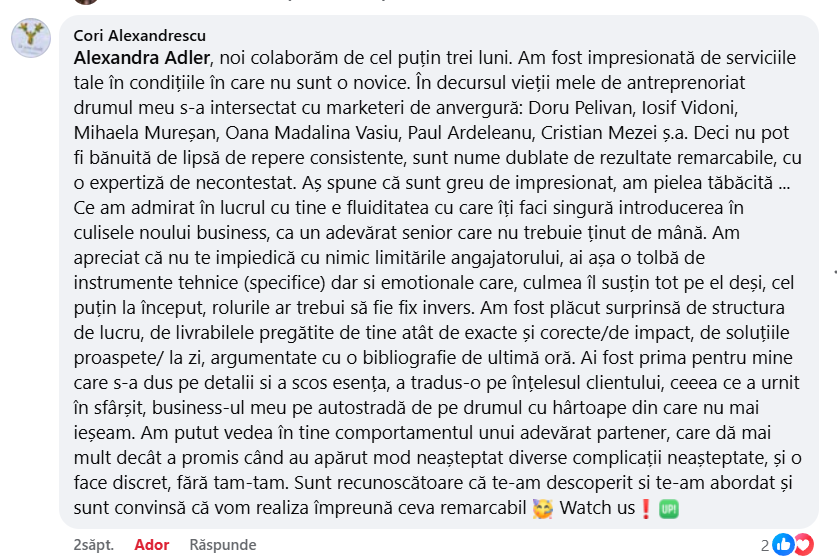 Pentru mai multe detalii, îmi poți scrie un mail la hi@alexandraadler.pro cu câteva detalii despre afacerea ta,provocările pe care le întâmpini și ce lucruri vrei să îmbunătățești și vedem dacă te pot ajuta.